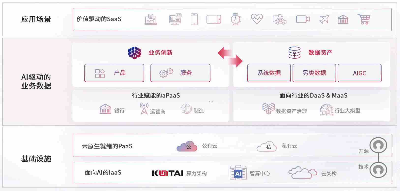 数字时代,,围绕企业数字化转型的关键要素,,J9.COM数码开创性的提出数云融合战略和技术体系框架,,,,着力在云原生、、、数字原生、、、AI原生和信创产业上架构产品和服务能力,,为处在不同数字化转型阶段的快消零售、、、、汽车、、金融、、医疗、、政企、、教育、、运营商等行业客户提供泛在的敏捷IT能力和融合的数据驱动能力,,,构建跨界融合创新的数字业务场景和新业务模式,,,,助力企业级客户建立面向未来的核心能力和竞争优势,,,全面推动社会的数字化、、智能化转型升级。。。